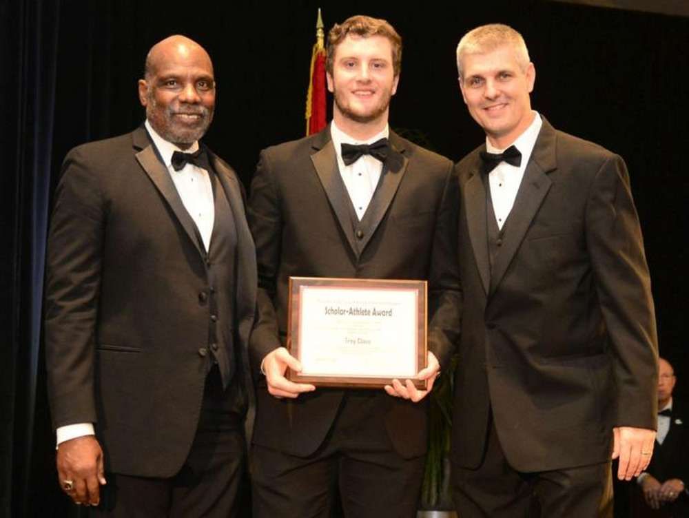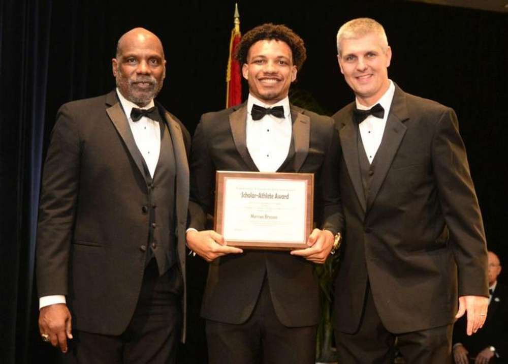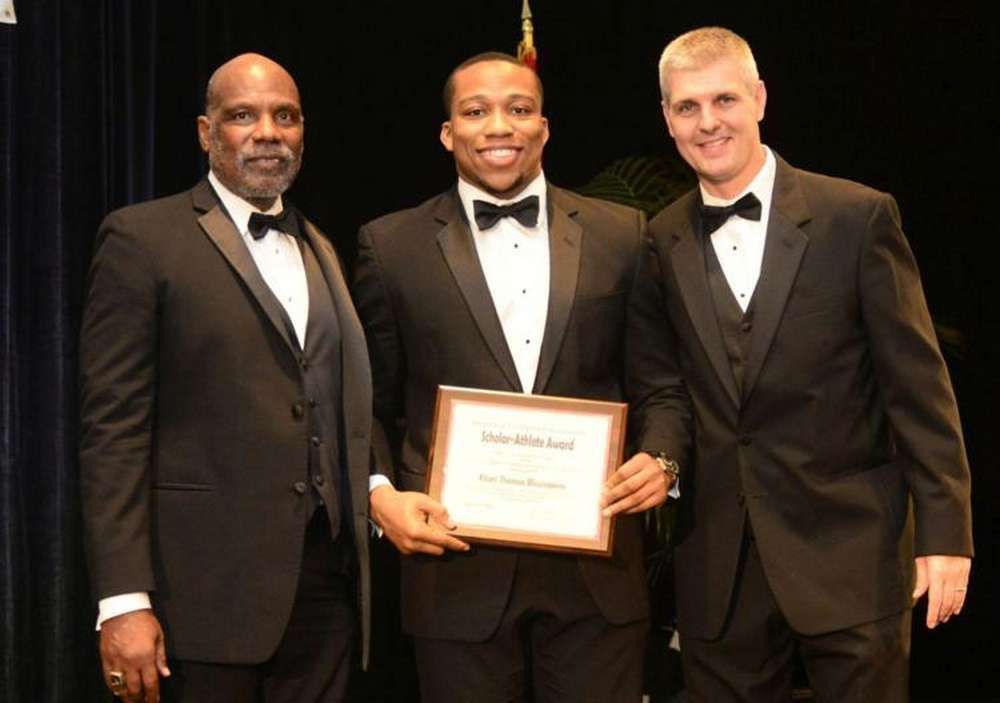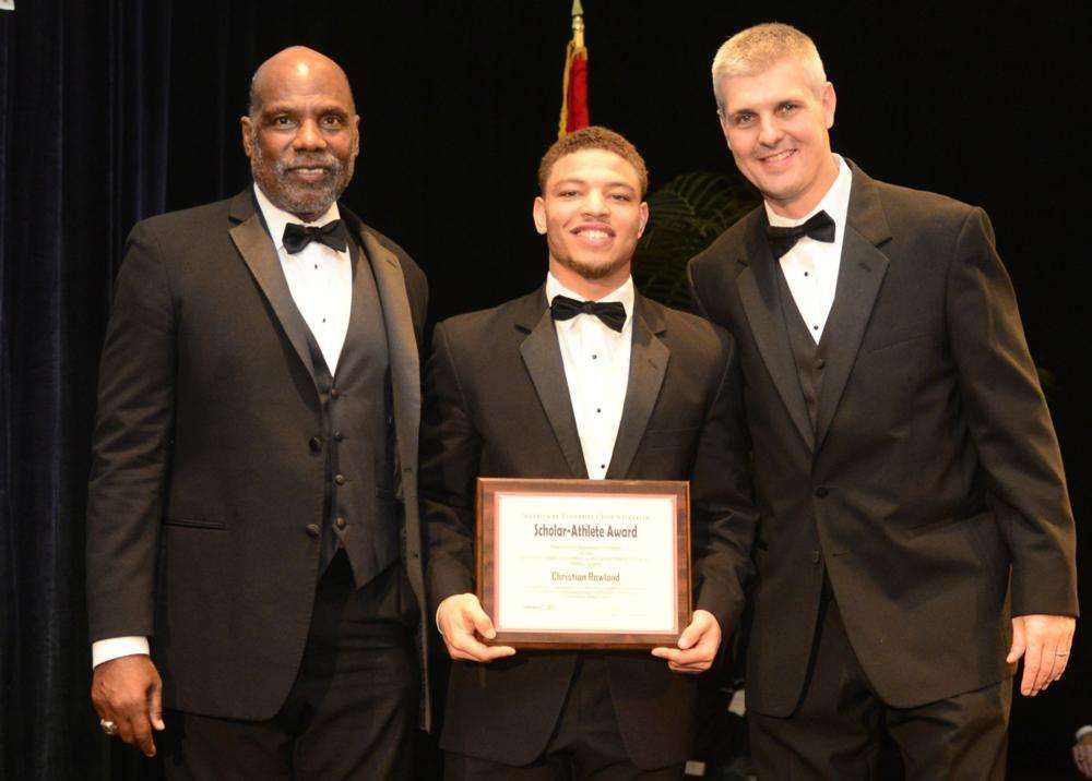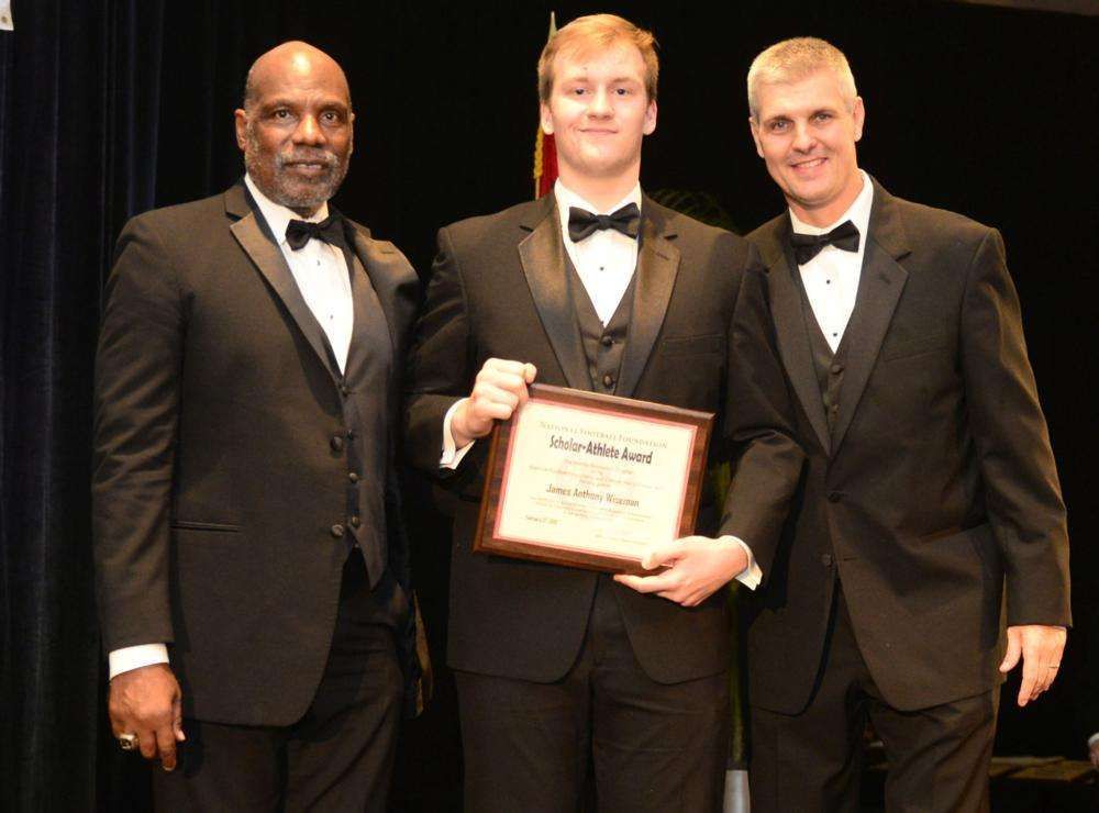 All plaques presented by NFF board members and retired NFL players Brenard Wilson (left) and Kelly Holcomb.