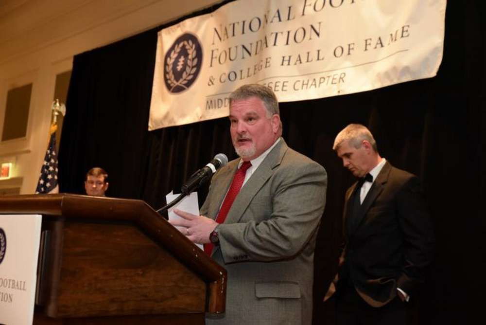MTSU’s head football coach Rick Stockstill (center) accepts the “2016 C.R. Bickerstaff / Bill Pace University Scholarship Award” on behalf of his son, Brent Stockstill.