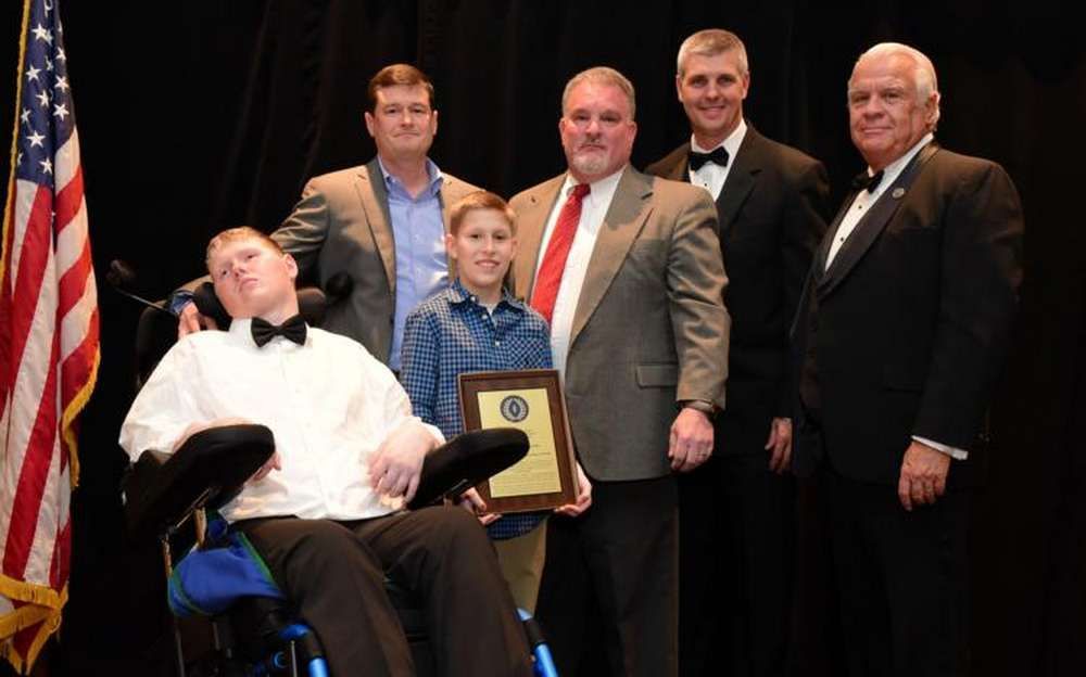 Weston Jay Schwerdt (center) from Hendersonville High School received the “2016 Joe L. Worden / Jack Redgren Courage Award” from NFF board members Ryan Aulds (left) and Wally Conyers.