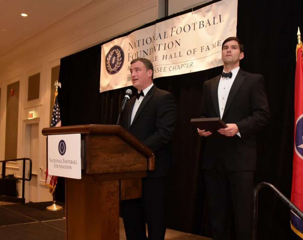 This award is presented to a Middle Tennessee high school student who serves as an inspiration to his teammates, his classmates and members of his community. Bramble was injured during a football game Oct. 23, 2015 while playing for Murfreesboro’s Siegel High School. Joining Baylor are from left, his father David Bramble, brother Brady Bramble, his head football coach Greg Wyant, NFF board members Kelly Holcomb and Bob Sullins.