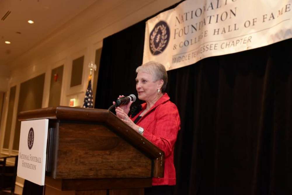 NFF board member Wallene Leek introduces Phillips as the winner of the Jim Barrom Spirit Award.