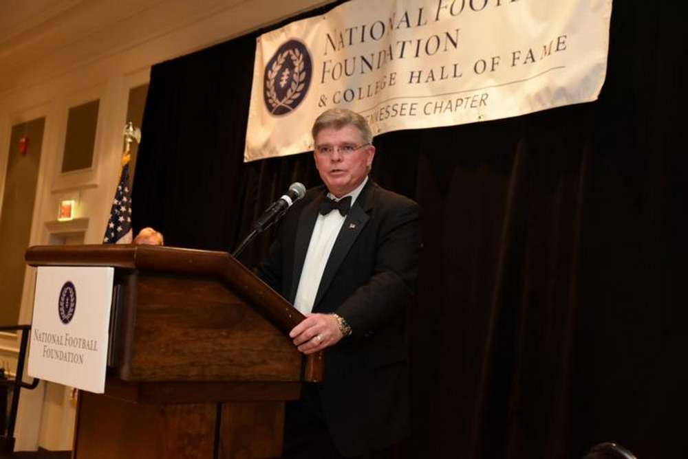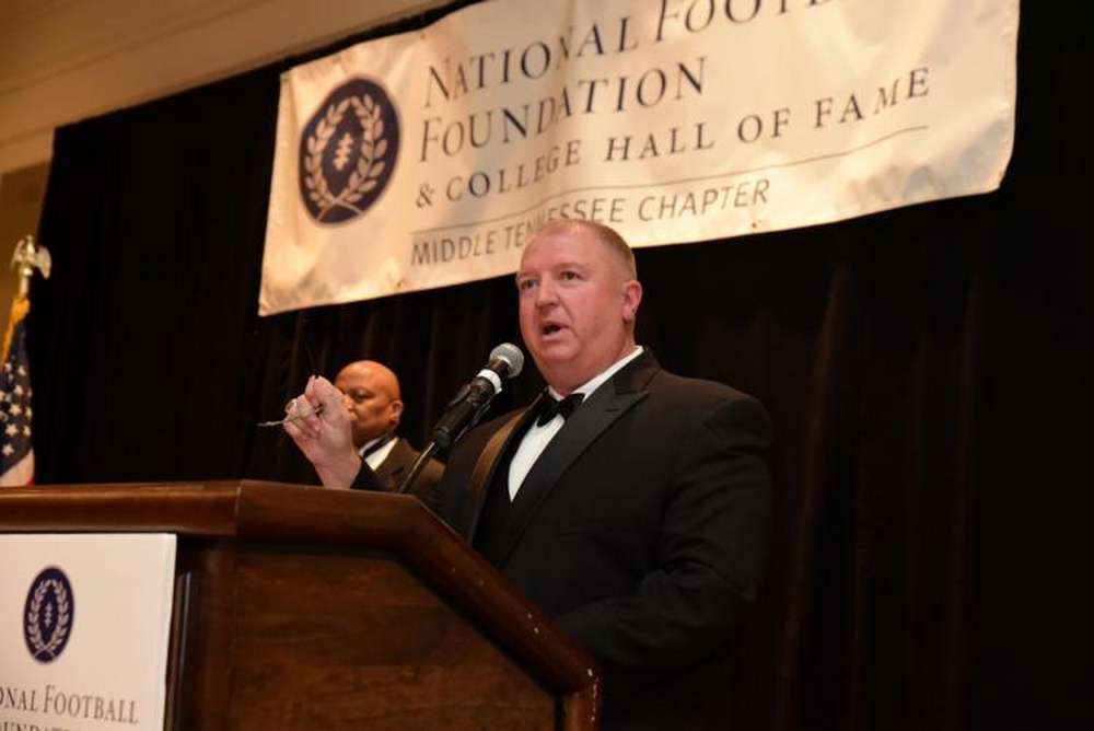 NFF board member Dewayne Alexander introduces Hendrixson as the winner of the “Cotton Clark Spirit Award.”