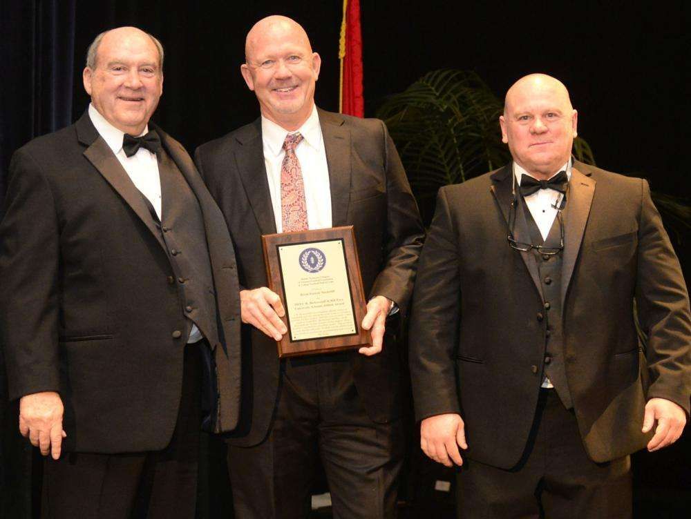 Brent Stockstill of Middle Tennessee State University was awarded the “C.R. Bickerstaff / Bill Pace University Scholarship Award.” Accepting was his father, Rick Stockstill (center), shown with NFF board members Boots Donnelly (left) and Mike Organ.