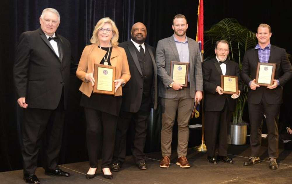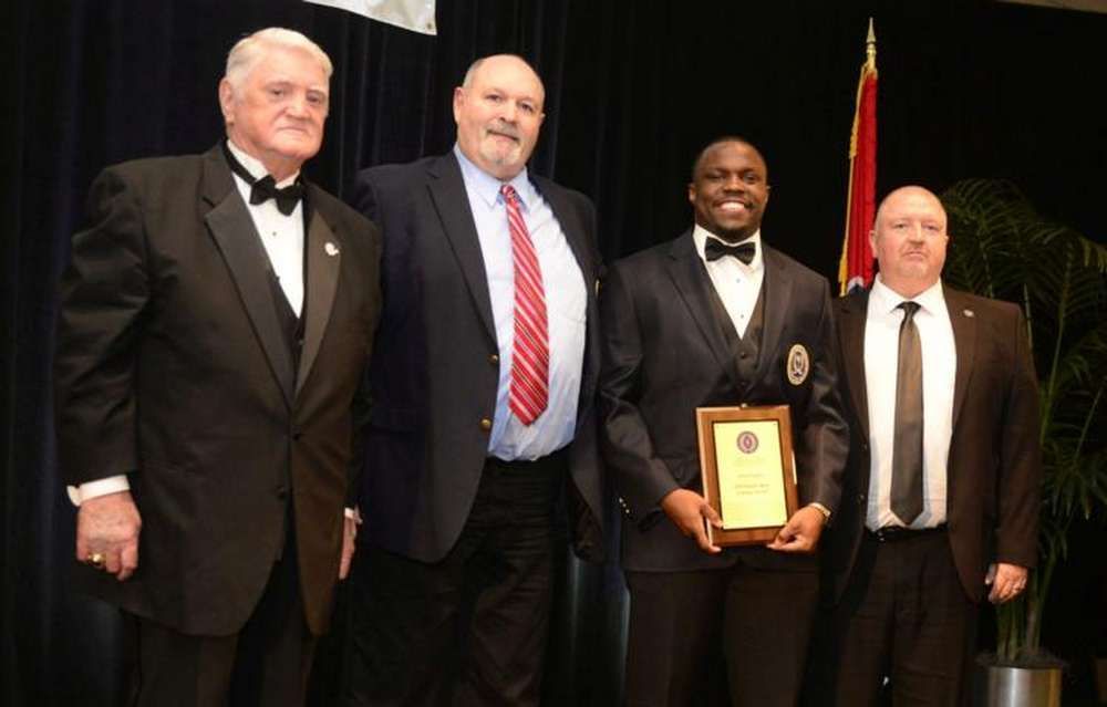 Presenting the award to Poplar are NFF board member Ray Thomas (who coached Sloan at Austin Peay), Bonnie Sloan, Poplar and NFF board member Dewayne Alexander, who was also Poplar's head coach at Tenn Tech.