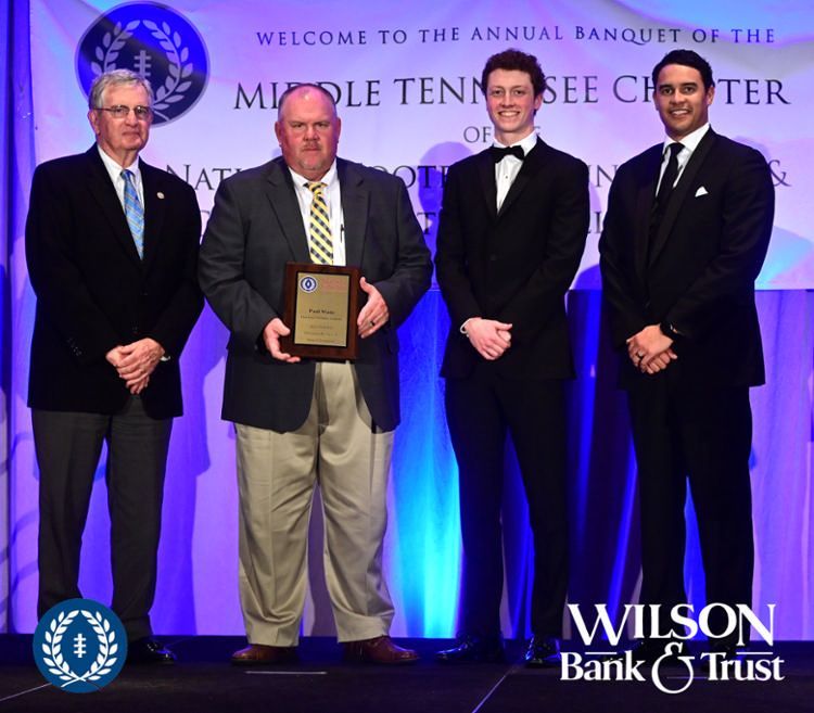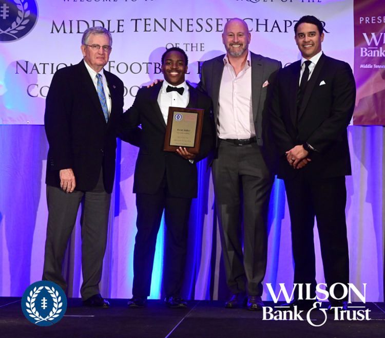 Donelson Christian Academy Head Coach Paul Wade (second from left) was recognized for leading his team to a 2021 Division II Class A state championship. Joining Wade in the presentation was NFF board member Ronnie Carter, DCA’s Gunner Schierling (also the recipient of the Admiral William P. Lawrence Award) and DeJeay Woods, NFF board member.