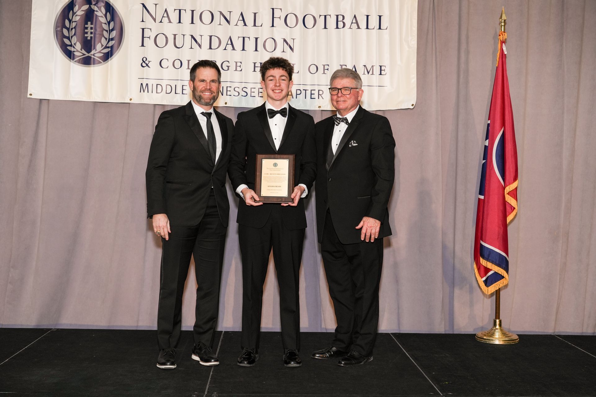 Elias Franks of Montgomery Bell Academy was selected as this year’s “Admiral William P. Lawrence Award” honoree. Presenting his plaque are Wally Conyers (left) and Charlie Hawkins (right).